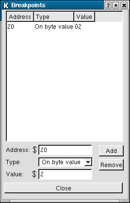 Breakpoints provide the ability for execution to be halted when a given condition is met. When the condition is reached, the application will bring up a pop-up box indicating the address at which the breakpoint has occurred and the value contained within that location. Execution can then be continued by pressing the START button on the main window.