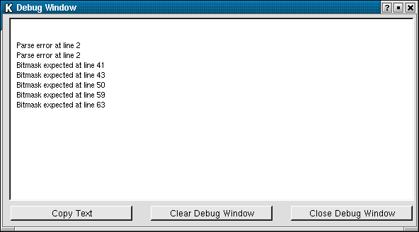 The debug window displays error message output by the parser when an MDL file is read in and is found to be invalid.