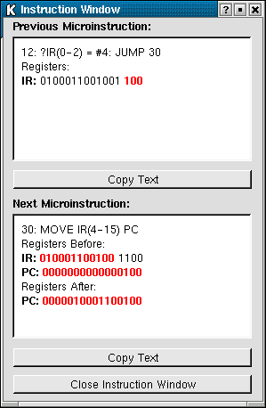 This window displays the previous and the next microinstruction as shown in the screenshot. The two windows show 16-bit binary values for registers that were used during the execution of the microinstruction, both source and destination. Where only part of the register has been accessed, only the relevant bits will be displayed in red and separated by a space character – the other bits will be displayed in black.