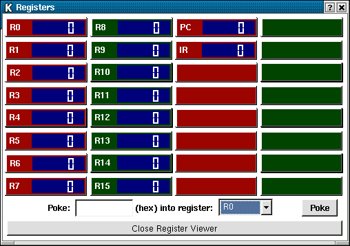 The register viewer shows the contents of all registers that are in use for the specified architecture, as defined by the MDL file. Although the icISE hardware specification contains 32 general purpose registers, any unused ones will be hidden. It is also possible to poke hex values into a register from here.