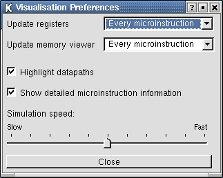 The visualisation preferences window provides a number of GUI configuration options which are generally self-explanatory. The drop-down lists enable registers and/or memory to be updated every microinstruction, every macroinstruction or only when execution has completed. The intention is to allow the user to control the speed of execution, by both increasing the simulation speed and by reducing the overhead of the GUI by disabling features such as datapath highlighting.